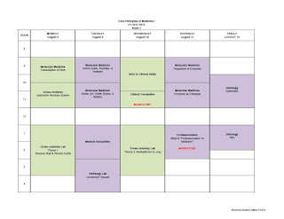 First and second year. One of the things I really wanted to know as a premed was what med students' schedules look like. I have attached my schedule for this week and next week as pictures. We have a block curriculum and have tests every two or three weeks. Click to enlarge.